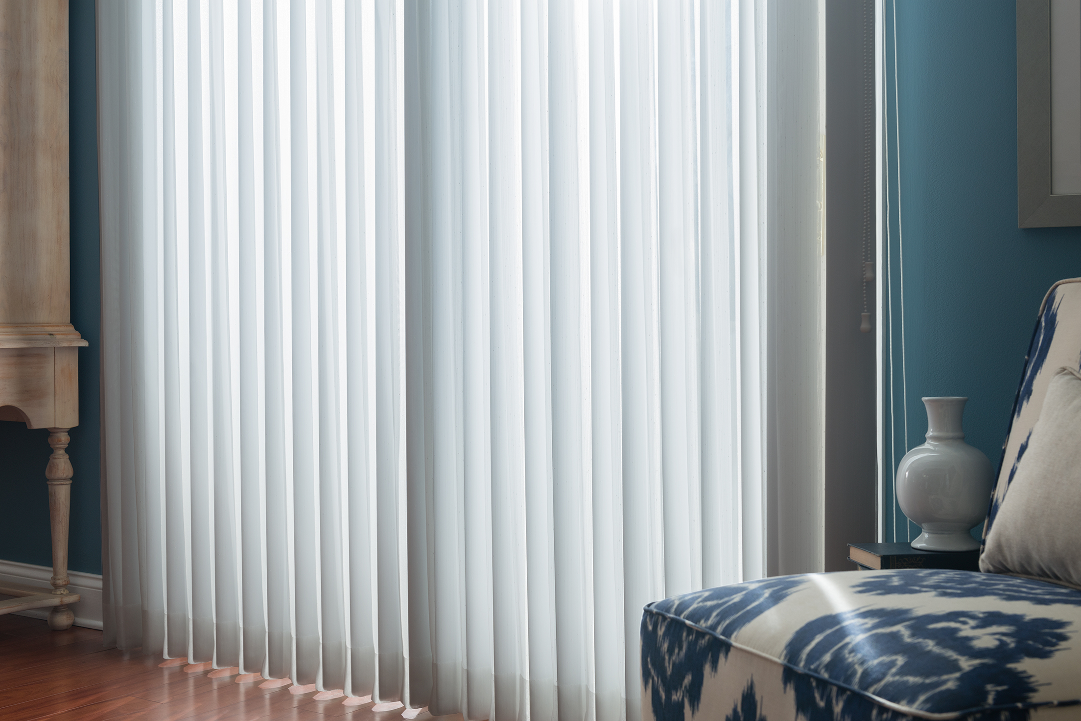 Vertical blind systems can come with a upgrade from the standard vinyl vertical slat. We offer vertical blinds that take on an added touch of design and softness. Both sheer fabrics and s-curve vertical blinds, provide a look closer to that of a drapery, but with the added light control of a vertical blind. These options still provide the light control of rotating slats, but add a softer touch to the design of the window treatment and room